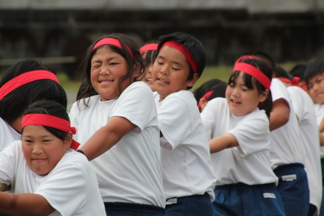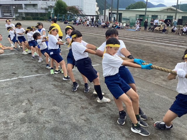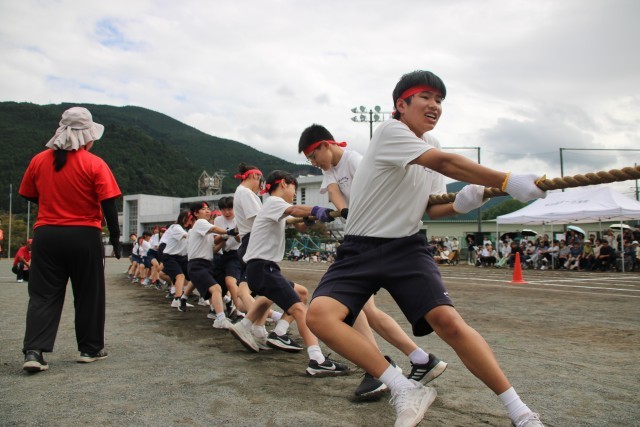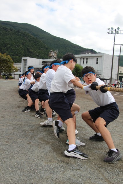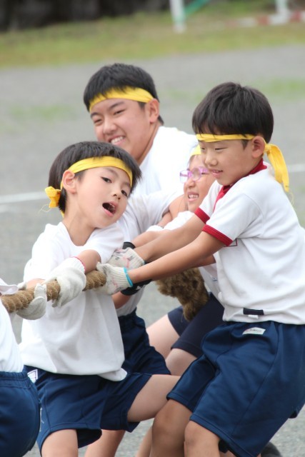 午後最初の種目は全校種目の「勝利を引き寄せろ」(綱引き)です。1~9年生が力を合わせて懸命に綱を引く顔つきがとてもたくましかったです。