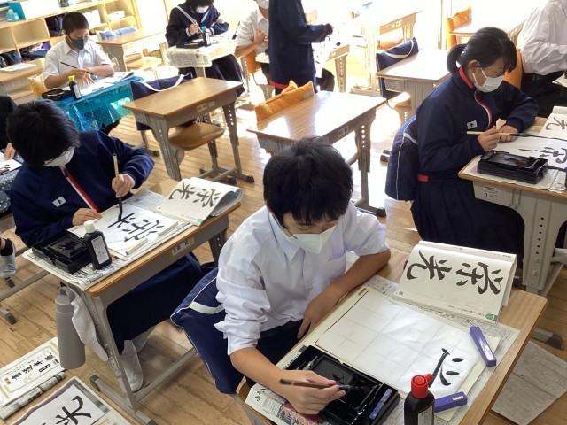 書写で、毛筆の学習をしています。前期課程では楷書体で字を書きましたが、後期課程から行書体で書きます。行書の特徴を確かめながら練習しています。