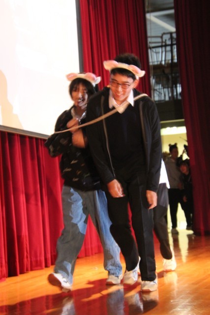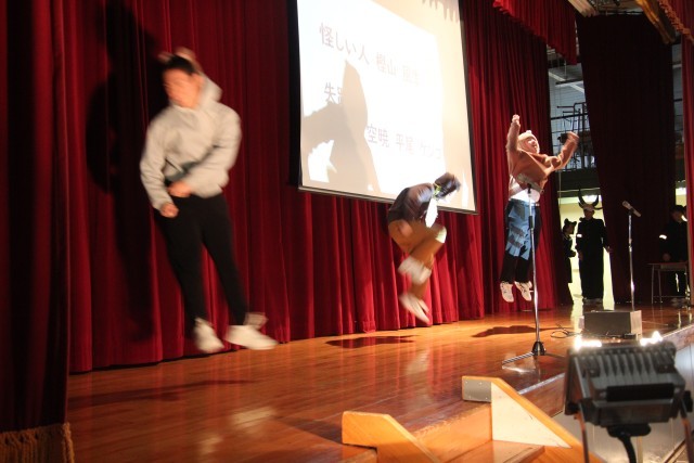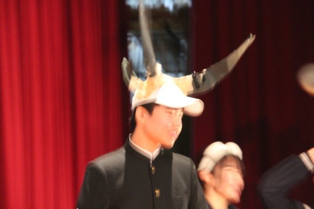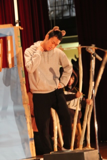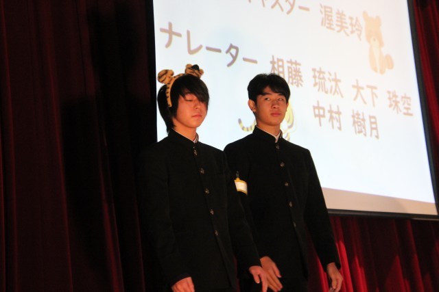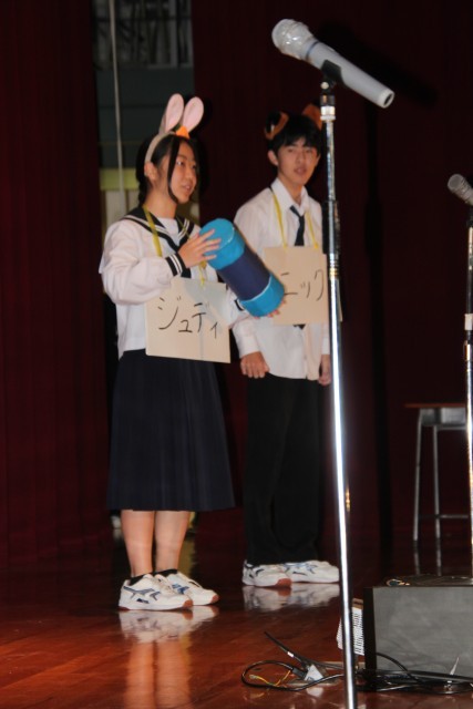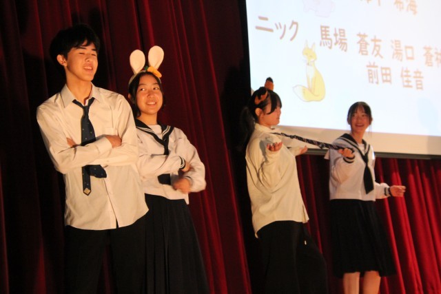 3番目は9年生の劇「自分らしく君らしく」です。自分たちでシナリオを考え、自分たちで指示や注意を出し合いながら完成を目指してきました。以前、練習場面を参観した際に、先生がほとんど口を挟まずに自分たちだけで練習をしていたのが印象的でした。