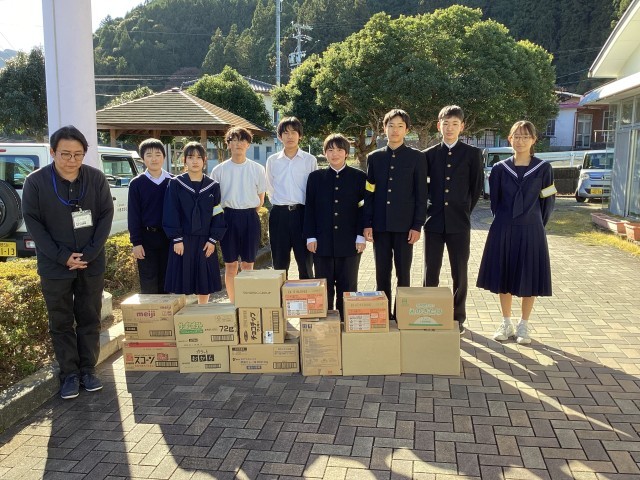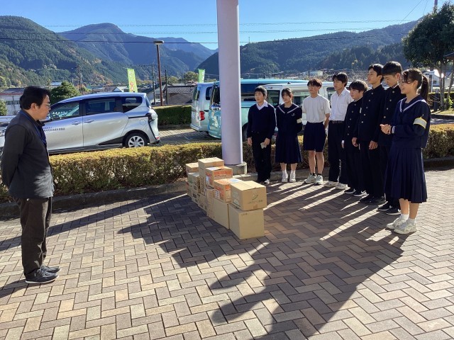 生徒会環境委員会が中心になって集めたエコキャップを社会福祉協議会に届けました。7月から11月に集めたエコキャップは約15,000個でした。