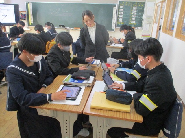 本年度、教員町内の義務教育学校にとして採用された3人の初任者の研修会が本校で行われました。3時間目は全ての学級を、4時間目は8年生の社会科の授業を参観してもらいました。