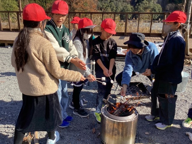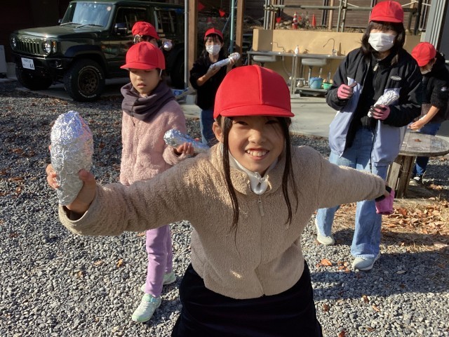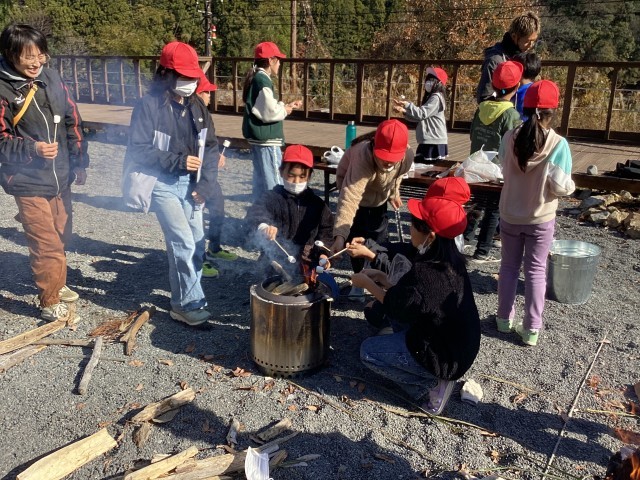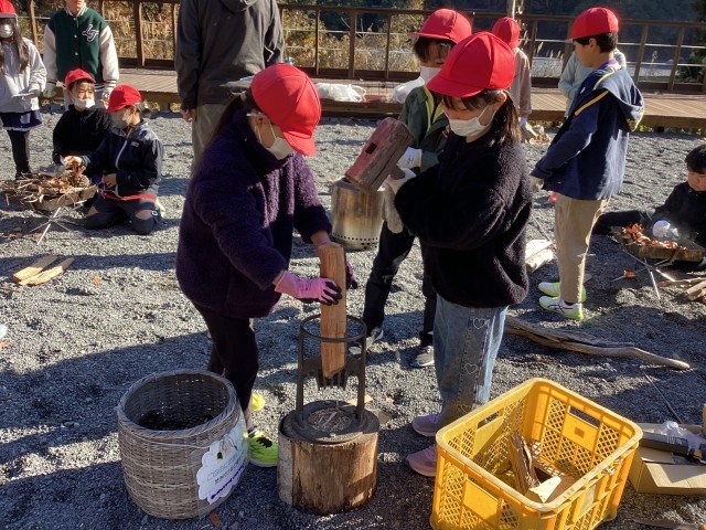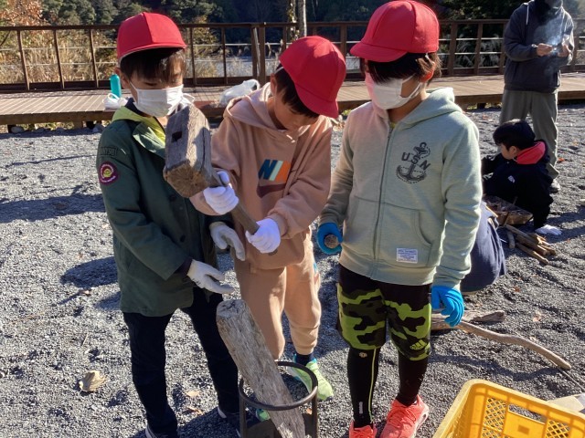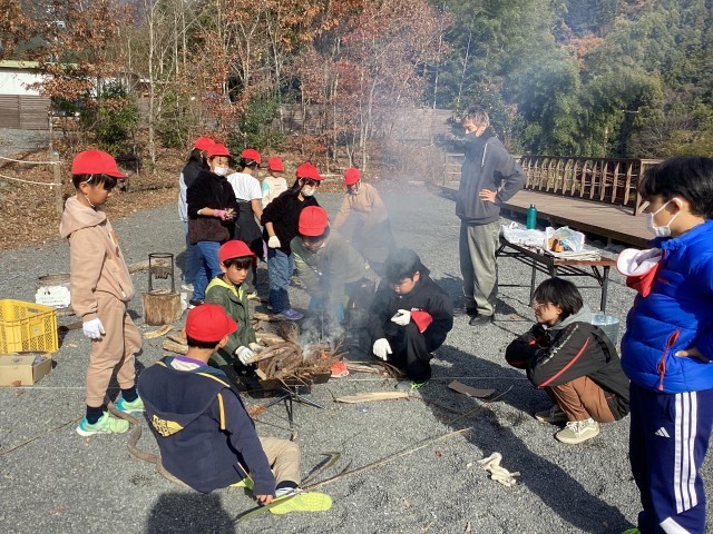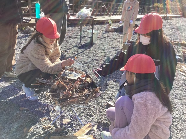 4年生はやきいもをやりました。河原で流木や枝を拾い、自分たちで割って薪を作りました。そして火起こしはなんと太陽の光を使って行いました。