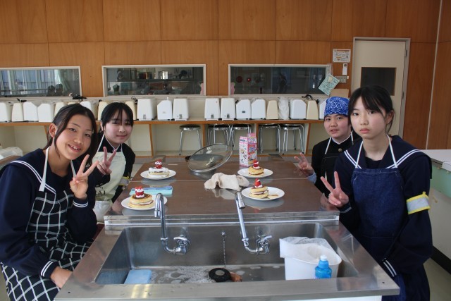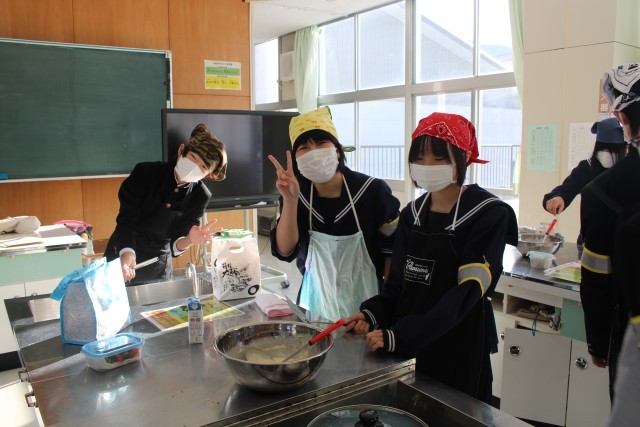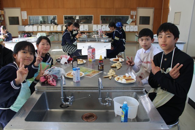7年生の家庭科の授業は調理実習。しかもお菓子作りです。調理室からは甘いにおいがぷーんと漂ってきました。