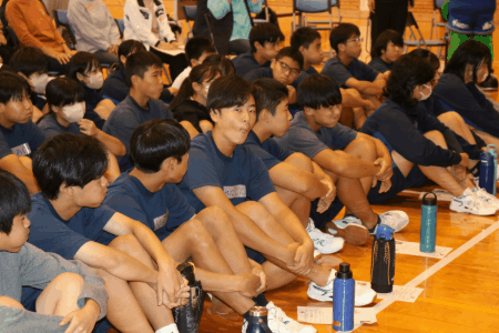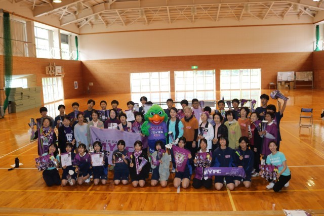 すこやか大学生と一緒に『声磨き』 10/21 公開日 2025/10/21 更新日 2025/10/21 お知らせ 本日の2,3時間目に「すこやか大学」の皆さんと後期課程の生徒たちが“声磨きの練習”をしました。川根本町とパートナーシップ協定を結んでいる藤枝MYFCの関係者の方や、日本声磨き普及協会のインストラクターさんの説明を基に、声の力を鍛えるトレーニングを行いました。藤枝MYFCのマスコット『けっとばし小僧』も登場し、会場は大いに盛り上がりました!