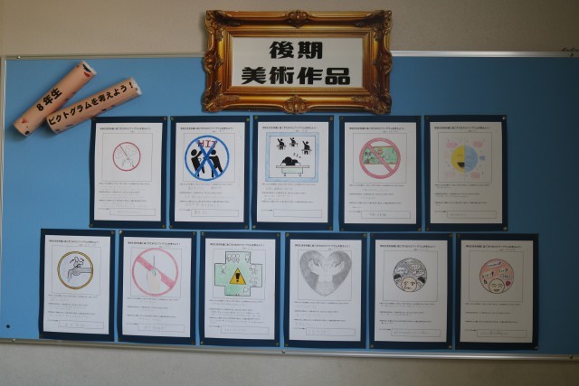 光の森学園では、校舎内いろいろな場所に、子供たちの作品が展示されています。写真は、階段の踊り場にあった8年生の美術作品『ピストグラム』です。