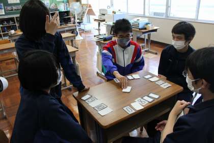 昼休みに両校の生徒会長対談を行いました。その他の生徒は教室で数学のカードゲームを楽しみました。